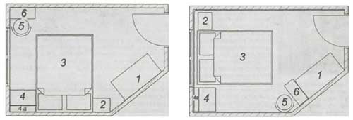 Поскольку высокий шкаф никак нельзя расположить возле труб, то его придется оставить на месте, а вот остальные, относительно невысокие предметы мебели попробуем подвигать по небольшому пространству. Стол-тумбу вместе со стулом передвинем к боковой стенке шкафа - это, пожалуй, единственное подходящее место для этой группы. А вот для кровати оставим центральное место в комнате, только установим ее изголовьем к окну (несмотря на трубы). На мой взгляд, такое расположение кровати в спальной более удобно (см. фото). По обеим сторонам от кровати поставим тумбу и комод, а вот книжную полку лучше повесить на стену (если она, конечно, предназначена для этого).